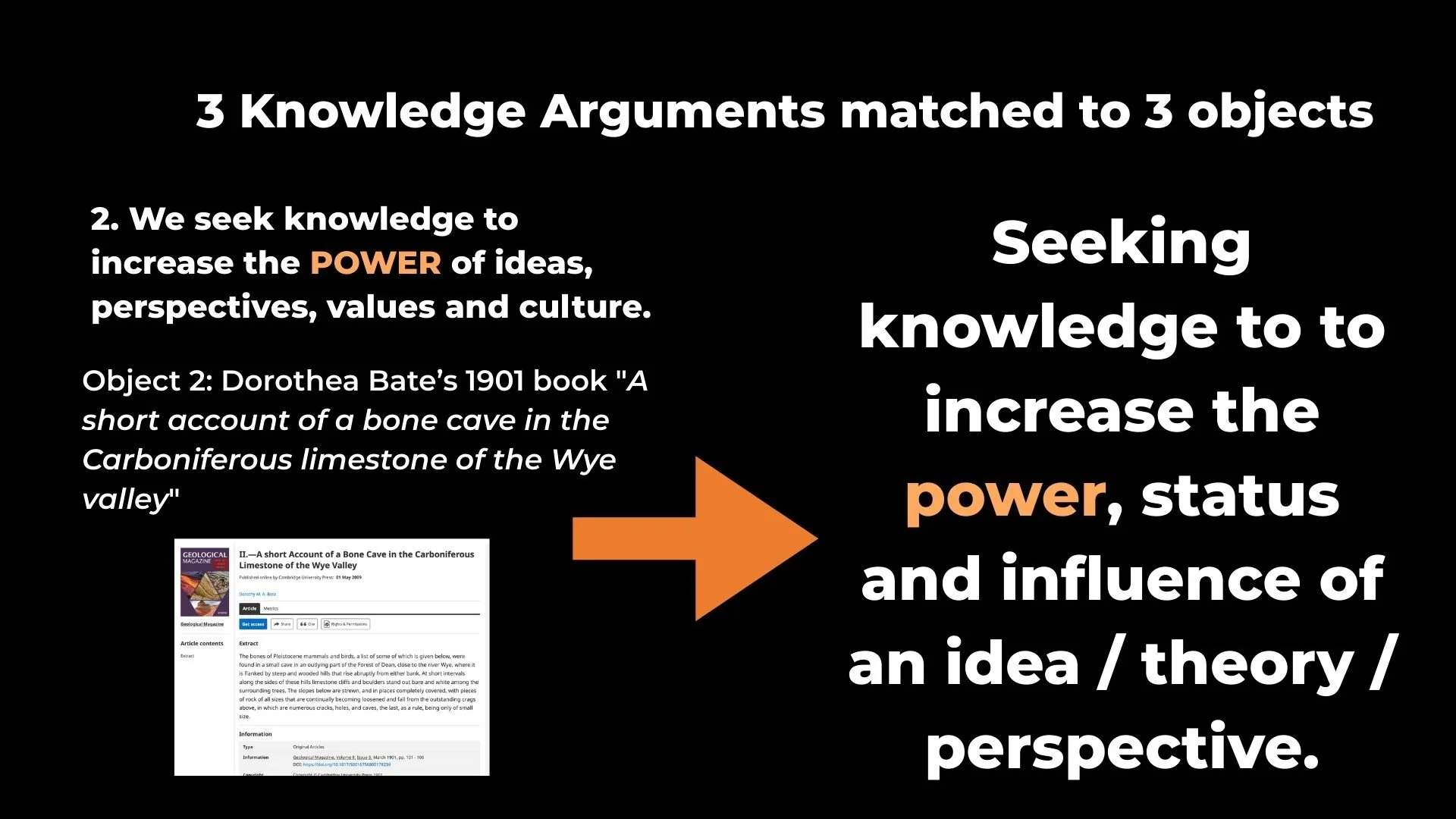 Justification: Bate was an early palaeontologist whose work provided tangible support for the theory of evolution by natural selection – a theory still controversial at the time. Her research contributed to the growing epistemological power of evolutionary theory. She was employed at the Natural History Museum in London, whose mission was to validate and popularise evolutionary science. This object demonstrates how seeking knowledge can serve to strengthen the intellectual legitimacy of a broader academic framework.