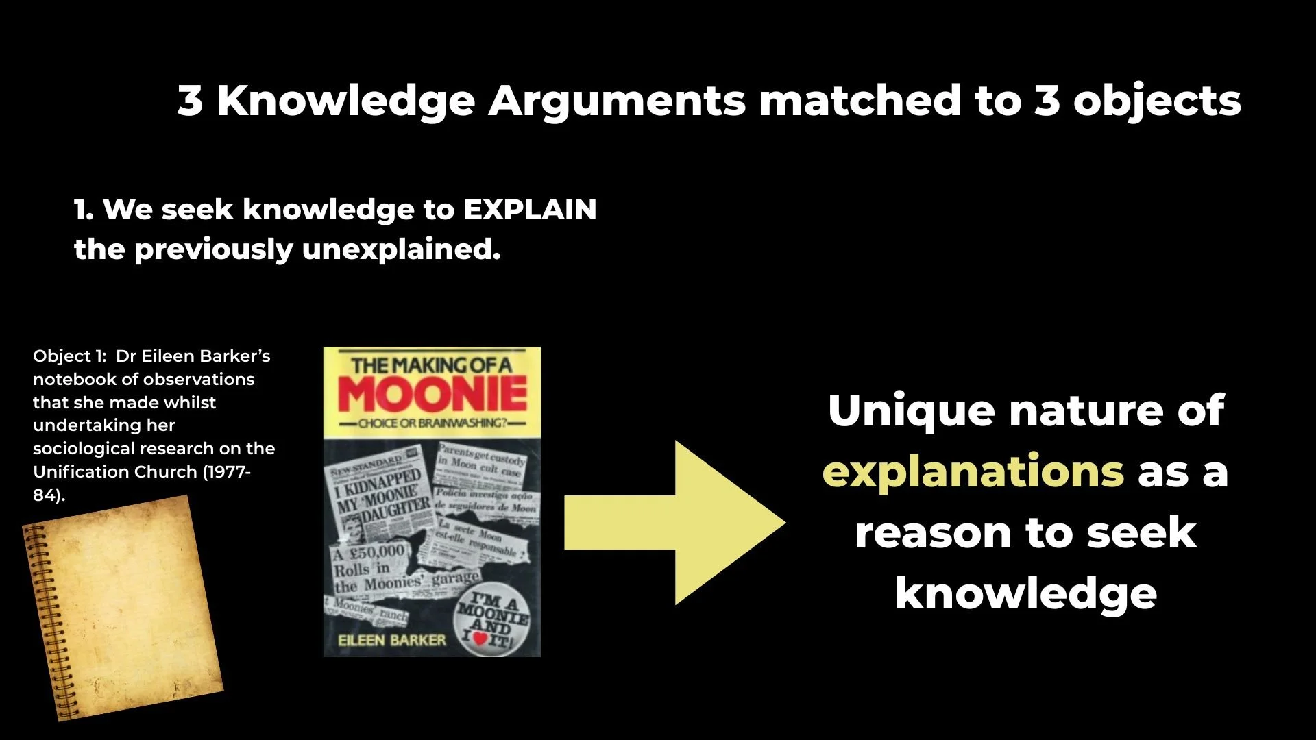 Justification: Dr Barker’s research sought to explain what initially appeared as irrational or puzzling behaviour – how individuals become deeply committed to cults. Her notebook represents a search for explanatory knowledge grounded in human sciences. Through careful observation and evidence gathering, she aimed to increase the reliability of our understanding of a complex social phenomenon.
